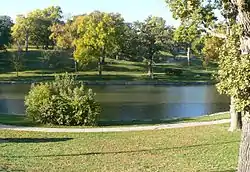 Hanscom Park, located at 1899 South 32nd Avenue, was developed by the City of Omaha in 1889 as one of the first by the newly formed Park Commission. After paying a landscape architect $913.30 for plans to improve the rough tract of land, the Commission reported the park was, "radically changed in plan and very greatly improved... Two lakes, a cascade, extensive flower beds, two and one-half miles of macadamized roadway, fountains and a magnificent growth of forest trees makes this the only finished park in the city." Design elements from that time have survived.[8] The Brandeis Indoor Tennis Courts facility is also located within the park property. The park is bordered on the East by Park Ave and the West border is 32nd Ave. The North border for the park is Woolworth Ave and the South border is Ed Creighton Ave.