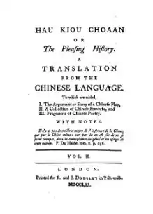 - ↑ Watt, James. "Thomas Percy, China, and the Gothic." The Eighteenth Century. Volume 48, Number 2, Summer 2007, pp. 95-109, 10.1353/ecy.2007.0013. Cited page 95: "While assembling the materials that were to make up his influential collection Reliques of Ancient English Poetry (1765), Thomas Percy issued the first translation of a Chinese novel in a European language, Hau Kiou Choaan, or, The Pleasing History (1761),[...]" - Available at Project MUSE