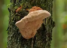 A saprobic species, Hapalopilus nidulans causes a white rot in its host. Fruit bodies of the fungus grow singly, in groups, or in fused and overlapping clusters on the wood of dead and decaying deciduous trees.[20] Preferred hosts include Quercus (oak), Fagus (beech), and Betula (birch), although on rare occasions it has been recorded on conifer wood as well.[12] In central Europe, its preferred host is oak, while in northern Europe it is found most commonly on Corylus and Sorbus.[22] Fruiting typically occurs from early summer to autumn, but the tough fruit bodies are persistent and may be encountered out of the usual growing season.[12]