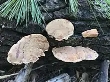 The cap is fan-shaped to semicircular and convex, reaching a diameter of 2.5–12 cm (1.0–4.7 in). It lacks a stalk, and is instead attached broadly to the substrate. The fruit bodies are initially soft and spongy, but become hard and brittle once they have lost their moisture. The cap surface is covered with matted hairs, has shallow concentric furrows, and a dull brownish-orange color. The flesh is up to 3 cm (1.2 in) thick at the thickest part, and is a pale cinnamon color. The pore surface is yellowish to brownish, and the pores are angular, numbering about 2–4 per millimeter.[20] In young fruit bodies, the pore surface bruises reddish brown. The mushroom's odor and taste ranges from sweetish to indistinct.[12]