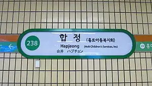 Hapjeong Station (Korean pronunciation: [hapt͈ɕʌŋ]) is a subterranean station of Seoul Subway Line 2 and Seoul Subway Line 6. The station is located just north of the Han River in Mapo-gu. The name of the subway station comes from its local name. The name of the area means clam well.[2]
