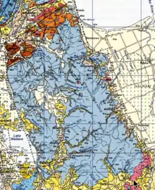 Cenozoic intrusive rocks surface at either end of the range; Tahuna unit (Mkt) at the south end[19] is 6–7 Ma basaltic andesite and pyroxene andesite, with eroded remnants of lava flows and volcanic breccias. Miranda Unit (Mkm), at the north end, is 13–10 Ma, also of basaltic and pyroxene andesite, but including dacite, tuff and hornblende.[20]