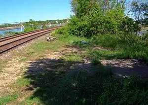 Harbor station opened in December 1977 to serve a new apartment complex (now The Heights at Cape Ann) located on a bluff above the tracks.[2][1] Several short turn trains (which had formerly terminated at Manchester but ran to an interlocking just west of Gloucester to switch tracks for the inbound journey) were extended to Harbor at that time.[2] Several trips, including the short turns, were cut in September 1979.[2] On January 30, 1981, service to nearby West Gloucester was discontinued during a round of budget cuts, leaving Harbor as the only station serving the area.[1]