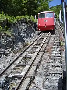 The Harderbahn (HB) is one of two funiculars that operate from the town of Interlaken. The Harderbahn leads to the western end of the Harder in the north of Interlaken across the river Aare, in Switzerland.