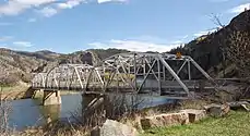 Eager to replicate the autobahn system of superhighways which Nazi Germany had constructed in the 1930s (and which proved critical to its war effort), the Public Road Administration (now known as the Federal Highway Administration) proposed a system of "interstate defense highways" in 1947. The agency's map of defense highways was based on the critical-needs designation of World War II. Nothing came of this proposal until 1956, when President Dwight Eisenhower signed the Federal Aid Highway Act of 1956 into law. This legislation largely implement the federal government's 1947 call for a system of ultra-modern, fast, easily accessed superhighways across the nation. The legislation authorized the expenditure of $25 billion to construct these "interstate highways" from 1957 to 1969.[21] Interstate 15's alignment north of Helena generated controversy, but an alignment along U.S. Route 91 was decided. One of the first contracts issued for a section of interstate was for the Ulm-to-Cascade section just north of Wolf Creek Canyon. The section through Wolf Creek Canyon was completed by the mid-1960s. (The state's first interstate rest area was completed in Wolf Creek Canyon in 1963.)[22] Most of U.S. Route 91 was removed during the construction of Interstate 91, although small portions through Wolf Creek Canyon continue to exist as frontage roads or local county roads.[18] Construction of Interstate 15 bypassed the Hardy Bridge, leaving the structure little-used.[2]
