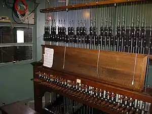 Midway to the top, four openwork copper clockfaces tell the hours. The bells of the carillon are behind the clockfaces, fixed to a frame made of steel I-beams. The playing console of the carillon is at the level of the balconies immediately below the clock faces. Lower levels of the tower house a water tank (no longer used), two practice carillons, the old chimes playing console, office space for the Yale University Guild of Carillonneurs, and a memorial chapel.