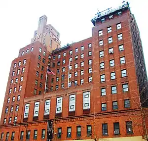 The Harlem YMCA is located at 180 West 135th Street between Lenox Avenue and Adam Clayton Powell Jr. Boulevard in the Harlem neighborhood of Manhattan, New York City. Built in 1931-32, the red-brown brick building with neo-Georgian details was designed by the Architectural Bureau of the National Council of the YMCA, with James C. Mackenzie Jr. as the architect in charge.[2][3] It replaced the building from 1919 across the street.[3] Inside the building is a mural by Aaron Douglas titled "Evolution of Negro Dance." The building was declared a National Historic Landmark in 1976,[5][6] and was designated a New York City Landmark in 1998.[2]