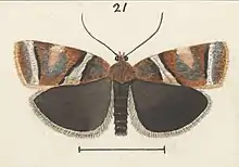 The wingspan is about 16 mm. The forewings are bright ochreous red with white fasciae. The hindwings are fuscous. Adults males were found amongst Veronica and other shrubs in January.[2]