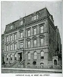 The Harmonie Club's original charter stated that it was created to provide "mutually beneficial entertainment, occasional singing entertainments, lectures, etc" for recent German immigrants. The first meeting of the club was held November 8, 1852 in a rented room on Broome Street with thirty-nine members in attendance. Between 1852 and 1867, the burgeoning club was regularly moved as the membership outgrew each rented space. After this nomadic period, the club purchased land at 45 West Forty-Second Street to erect a permanent location and raised enough funds to have architect Henry Fernbach design the building. Later, this building was refurbished and had an annex added, both of which were designed by Herts and Tallant, architects of the Brooklyn Academy of Music and Coram Library at Bates College.