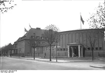 The Harnack House (German: Harnack-Haus) in the Dahlem district of Berlin, Germany was opened in 1929 as a centre for German scientific and intellectual life. Located in the intellectual colony of Dahlem, seat of the Free University Berlin, it was founded by the Kaiser Wilhelm Gesellschaft (KWG) on the initiative of its first president, the theologian Adolf von Harnack, and of its then chairman, Friedrich Glum. The project was supported politically by the Weimar Republic Chancellor Wilhelm Marx and Foreign Minister Gustav Stresemann, and an influential Centre Party deputy Georg Schreiber. The land for its construction was donated by the state of Prussia, and the costs of building and furnishing the house were defrayed partly by the government (which contributed 1.5 million marks), and partly by public subscription (which raised about 1.3 million marks).