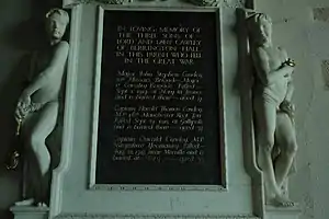 All three brothers are commemorated on the Parliamentary War Memorial in Westminster Hall. Harold and Oswald, on Panel 8, are among the 22 MPs that died during World War I to be named on that memorial. John, included on the memorial as the son of an MP, appears on Panel 2 of the memorial.[9][10][11] Harold Cawley is one of 19 MPs who fell in the war who are commemorated by heraldic shields in the Commons Chamber.[12]