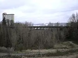 The Harold G. Moss Bridge, originally the East 34th Street Bridge, is a concrete open-spandrel bridge in Tacoma, Washington. The bridge was opened on October 20, 1936, to replace a wood bridge that had previously spanned the gulch.[2] The bridge is constructed of two rib arches, that are supported by 24-foot (7 m) support legs, with spandrel columns between the arches and the bridge's 485-foot (148 m) deck. The concrete railings on the deck are adorned with urn-shaped lampposts.[3]