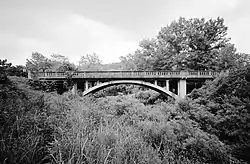 The Harp Creek Bridge is a historic bridge in rural northern Newton County, Arkansas, carrying Arkansas Highway 7 across Harp Creek in the hamlet of Harrison. It is an open-spandrel arch bridge, built out of reinforced concrete in 1928 by the Luten Bridge Company. The arches span 69 feet (21 m), and are mounted on piers set 24 feet (7.3 m) from the abutments. The total structure length is 117 feet (36 m), and the deck is 23 feet (7.0 m) wide. Concrete balustrades line the sides of the bridge.[2]