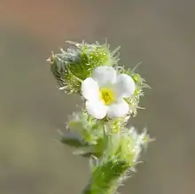 Harpagonella is a genus of flowering plants in the borage family. They are known as the grappling-hooks, because of the appearance and function of their fruits.[1] The strange fruits are two small nutlets enclosed in a burlike calyx, which is armed with numerous spines covered in minute, hooked barbs.[2] These diminutive, annual plants are found in sandy, clayey, and gravelly soils, and have small white flowers. This genus is native to North America, and is found in southern California, southern Arizona, northern Sonora, and the Baja California peninsula.[1][3]