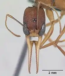 Head view of a Harpegnathos saltator worker, showing their characteristic long scythe-shaped mandibles