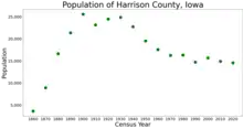 Harrison County is a county located in the U.S. state of Iowa. As of the 2020 census, the population was 14,582.[1] The county seat is Logan.[2] The county was formed in 1851.[3] It was named for ninth US President William Henry Harrison.[4]