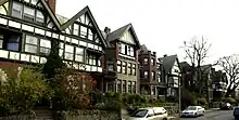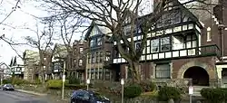 Harriswood Crescent is a historic series of rowhouses at 60-88 Harold Street in the Roxbury neighborhood of Boston, Massachusetts. It consists of 15 units designed by J. Williams Beal and built in 1890. The Tudor Revival buildings are remarkably unaltered, and retain their park-like setting. They are 2+1⁄2-story structures, built out of stone, brick, and stucco with half-timbering. The layout is a modern echo of a style propounded by Charles Bulfinch, most visible in Boston's Tontine Crescent.[2]
