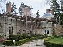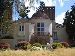 The Mediterranean-style mansion is on a property "the equivalent of seven standard city lots" adjacent to Laurelhurst Park and offers views of the Tualatin Mountains.[3][4] The house contains a round tower, multiple chimneys, a red-tiled roof, bronzed iron gates, and Art Deco accents with a peacock motif.[5][6] A bell-cast entrance tower, which contains a curved stairway and a vestibule, anchors "sweeping and curved low-pitched roofs".[6] Next to the tower is the living room's fireplace chimney. To the right of the entrance hall is the formal living room that opens to the parterre overlooking Laurelhurst Park.[6] To the entrance hall's left is the dining room, followed by a curved wing housing the kitchen, service areas and garages.[6] The interior features a marble-floored ballroom, heated pool, servants wing, and elaborate woodwork, tile, metalwork and sculpture.[3] Surrounding the French doors leading outside from the entrance hall are columns supporting paired peacocks cast in stone.[6]