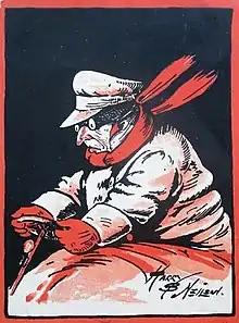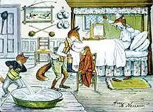 Neilson illustrated many children's books, several of them for the children's writer S. H. Hamer,[8] who conveniently was also an editor with Cassell & Co. Neilson also worked as an illustrator of magazines and designed postcards and Christmas cards.[9] In much of his work he depicted animals dressed as people, like his contemporaries Beatrix Potter and Harry Rountree,[10] but often showing them in more vigorous activities. In France he has been compared with Benjamin Rabier.[1][11] His best-known work, "Mr Fox's Hunt Breakfast on Xmas Day" (pictured) is said to represent five members of the Blankney Hunt, in Lincolnshire[12] and has been widely reproduced.[13] Dressed for hunting, the breakfast party is eating pheasant and drinking Renard (French for "fox") champagne. Pictures on the wall behind are of hunting scenes, but with foxes in pursuit of men, one of whom is going to ground.[14] The original, a large chromolithograph, was a free gift to readers with the Christmas issue of the Penny Illustrated Paper in December 1897. One hundred years later, in December 1997, it was used as the cover art for the Christmas-week issue of the British magazine Country Life.[13]