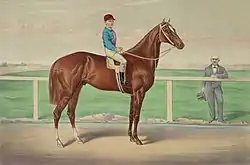 As a three-year-old, Harry Bassett also won the Jerome Handicap, the Travers Stakes, the Reunion Stakes, the Kenner Stakes, the Champion Stakes and the Jersey Derby.[5] During his three-year-old year Harry Bassett started 11 times and won eight, finishing second in the remaining three. At four he increased his win record to 14, with wins in the Westchester Cup and a victory in a 2 miles (3,200 m) heat, before he was beaten in the Monmouth Cup by Longfellow.[6] He then won the 2+14 mile Saratoga Cup, in which he defeated Longfellow.[5] His jockey in that race was James Rowe Sr., who went on to become a leading trainer for James R. Keene.[8] At age five, Harry Bassett started eight times, winning two, placing second in two, and third once. At six, he started four times, winning once and placing third once.[6]