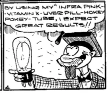 His contributions to the Canadian Whites were generally featurettes of 2–3 pages in length, cartoony and goofy in nature, whose titles heavily drew on alliteration.[3] Titles included Goofy Gags, Barnacle Bull, Kernel Korn, Professor Punk, Loop the Droop, Lank the Yank, and Buz and his Bus.[3] The only title that broke the pattern was his final creation, J. C. Flatbottom, which may have had an autobiographical character.[3] A self-caricature figured in one of the later Lank the Yank stories.[4]