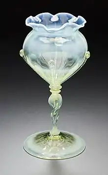 From the beginning of his career, Powell studied the history of glass and glass making. He scientifically analyzed historic glassware and would to try to recreate the old glass. He also investigated new kinds of glass. Powell discovered that by exposing glass to higher temperatures, he could change the colour in dramatic ways. By 1877, Powell had successfully produced new opalescent glass, a milky opaque straw opal and blue opal, which were very well received in the America.[1]