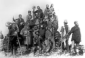 ![]() Harry Peters, standing far right, with a party of climbers on the summit of Mount Taranaki, 11 Feb 1892 | |