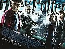 As with the previous films, EA Games produced a video game based on the film.[79] On 10 March 2009, it was announced that there would be a video game soundtrack, which was released on 17 March 2009.[80] On 27 March, six character posters were released: Harry, Dumbledore, Ron, Hermione, Draco and Snape.[81] A Japanese version of the international trailer was released, alongside the original one on 10 April.[82] On 8 May, The CW aired a 30-second TV spot, which focused on the romantic side of the film.[76][77] On 20 May, first clip from the film was released through The Ellen DeGeneres Show's official website, showing a love-struck Ron.[83] Another clip of the film, showing Dumbledore visiting Tom Riddle's orphanage, was released on 31 May 2009, at the MTV Awards.[84]