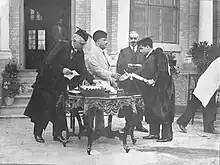 Salman Faeq receives his certificate from the Royal Medical College in Baghdad and in front of him, the doctor, Harry Sandersen, picking up something from the table 1933