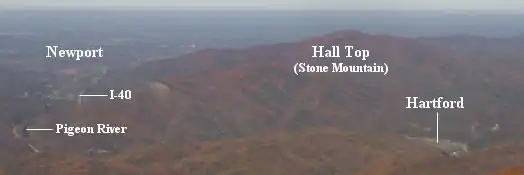 Hartford is surrounded by mountains on all sides, with Snowbird Mountain rising some 4,200 feet to the east and Mount Cammerer— the easternmost of the Great Smokies— rising nearly 5,000 feet to the south. To the west, Foothills Parkway traverses Green Mountain, connecting the Pigeon Valley to Cosby, Tennessee. Stone Mountain, commonly called Hall Top, dominates the area to the north.