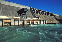 Hartwell Dam is a concrete and embankment dam located on the Savannah River at the border of South Carolina and Georgia, creating Lake Hartwell. The dam was built by the U.S. Army Corps of Engineers between 1955 and 1962 for the purposes of flood control, hydropower and navigation. The concrete and earthen structure spans 15,840 feet (4,828 m). The concrete section is 1,900 feet (579 m) long and rises 204 feet (62 m) above the riverbed at its apex. The Hartwell Dam currently produces 468 million KWh of electricity annually, has prevented over $40 million in flood damage since completion and also provides recreation, water quality, water supply, along with fish and wildlife management.[1]