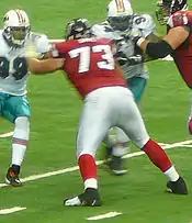 In 2008, he became a full-time starter for the Falcons at right guard at the age of 27.[12] He established a name for himself as one of the Falcon's toughest, nastiest players. He also helped pave the way for the Falcons' Pro Bowl running back Michael Turner and the Falcons' run game, which was second in the league in rushing. Dahl was competent in pass blocking as well, as he and the rest of the Falcons offensive line only allowed 17 sacks (a franchise record) of 2008 AP Offensive Rookie of the Year quarterback Matt Ryan.