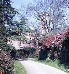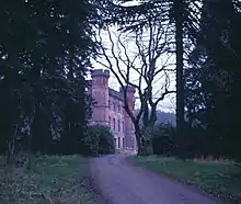 After fire destroyed much of the Playfair building at nearby Dollar Academy in 1961, Harviestoun Castle acted briefly as a satellite for Prep (Primary) School classes, as secondary school pupils occupied the Preparatory School building. Much of the castle was 'out of bounds' due to structural problems (possibly dry rot), but was a popular home for pupils of that era, according to accounts in school magazines. The grounds featured extensive gardens framed by two giant sequoia trees on the south lawn, and extensive plantings of rhododendron and bamboo. The castle was demolished in 1970.[4] For a period in the 1970s a small private coal mine operated on the estate.