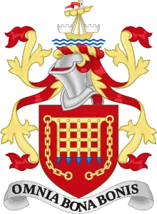 On a wreath of the colours upon waves of the sea Proper an ancient ship with one mast Or at the bow and stern turrets and affixed below the top of the mast a tower Argent the sail furled of the last and flying to the dexter a pennon Gules.