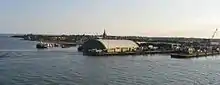 Harwich Dockyard was established as a Naval Dockyard in 1652. It ceased to operate as a Royal Dockyard in 1713 (though a Royal Navy presence was maintained until 1829). During the various wars with France and Holland, through to 1815, the dockyard was responsible for both building and repairing numerous warships. HMS Conqueror, a 74-gun ship completed in 1801, captured the French admiral Villeneuve at Trafalgar. The yard was then a semi-private concern, with the actual shipbuilding contracted to Joseph Graham, who was sometimes mayor of the town.[7] During World War II parts of Harwich were again requisitioned for naval use and ships were based at HMS Badger; Badger was decommissioned in 1946, but the Royal Naval Auxiliary Service maintained a headquarters on the site until 1992.[8]