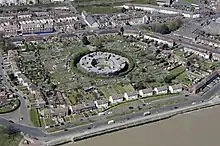 Writer Daniel Defoe devotes a few pages to the town in A tour thro' the Whole Island of Great Britain. Visiting in 1722, he noted its formidable fort and harbour "of a vast extent".[6] The town, he recounts, was also known for an unusual chalybeate spring rising on Beacon Hill (a promontory to the north-east of the town), which "petrified" clay, allowing it to be used to pave Harwich's streets and build its walls. The locals also claimed that "the same spring is said to turn wood into iron", but Defoe put this down to the presence of "copperas" in the water. Regarding the atmosphere of the town, he states: "Harwich is a town of hurry and business, not much of gaiety and pleasure; yet the inhabitants seem warm in their nests and some of them are very wealthy".[6]