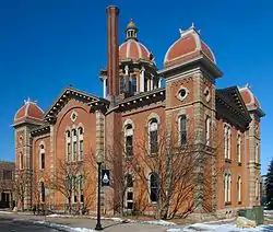 Hastings City Hall, formerly the Dakota County Courthouse, is a historic government building in Hastings, Minnesota, United States, completed in 1871. It was the original courthouse for Dakota County and now serves as city hall. It was designed by A.M. Radcliff, one of Minnesota's first architects, in an Italian Villa style. Although an addition built in 1955 in an entirely different style damaged the building's integrity, the building remains a prominent structure in downtown Hastings. The courthouse served as the seat of Dakota County government from 1871 until September 1974, when the county commissioners held their last meeting in the building. It became the Hastings City Hall in 1993.[2]