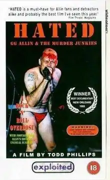Hated: GG Allin and the Murder Junkies is a 1993 documentary film directed by Todd Phillips. The film is about the life of GG Allin, a punk rock musician[1] who was infamous for extreme behavior (violence, obscenity, drug abuse) and his stage shows becoming confrontational events involving indecent exposure (stripping and performing naked was one of Allin's most common rituals), onstage defecation and coprophagia, physical assault (both on and by Allin), and obscene language. The filmmakers shot additional material on his death (from a heroin overdose during post-production) for inclusion in the film. The film is Phillips' directorial debut, who was a junior at New York University during production.