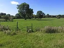 The River Weaver runs north–south forming the western boundary of the parish, Artle Brook runs on or near the northern boundary, and Birchall Brook forms part of the south-western boundary. The terrain is undulating, sloping more steeply down to the Weaver in the west, with a lowest elevation of around 38 metres (125 ft) along the Weaver. The highest area is in the south of the parish, around Birchall Moss and south of Bridgemere Lane, at around 72 metres (236 ft). The entire civil parish is classified by Cheshire Wildlife Trust as "Lower Farms and Woods", and the area in the south of the parish around Birchall Moss has been identified as a key area for wildlife.[13] There are numerous small meres or ponds, as well as small areas of deciduous and mixed woodland, including Birchall Moss, Birchenhill Wood, Acton's Rough, Lane Wood, Gorse Wood, Chestnut Wood and Blackthorn Wood.[2][3] Chestnut and Blackthorn Woods, which line Birchall Brook on the boundary with Hankelow, are marked on tithe maps and might represent small patches of ancient woodland.[14]