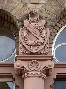 The almost symmetrical brickwork in the styles of Gothic Revival and Renaissance Revival consists of a protruding Avant-corps with a Rundbogenstil portal and an impost, which is flanked by two pillars. The end of the columns is formed by two sandstone coats of arms: one with the Prussian eagle, the other with the coat of arms of Hattenheim, but the martyr palm of the church patron Vincent of Saragossa is incorrectly represented as a feather. The arch windows of the ground floor have circular mullions and enclosing stones. A terracotta frieze with wine rack reliefs surrounds the whole building. An annex that was completed around 1900 extended the building to the east. Another entrance building of this type, probably also designed by Rowald, can be found in Geisenheim.