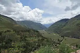 ![]() The northern slope of Hatun Pukara (on the left), the village of Taray and the Willkanuta valley as seen from Ñustapata | |