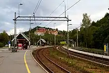 Hauketo Station (Norwegian: Hauketo Stasjon) is a railway station on the Østfold Line. It is located in the Hauketo neighborhood in the Søndre Nordstrand borough of Oslo, Norway. Situated 8.68 kilometers (5.39 mi) from Oslo Central Station (Oslo S), it features two side platforms. Hauketo is served by the Line L2 of the Oslo Commuter Rail, providing two to four services each hour.