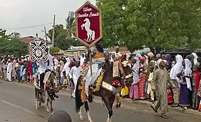 Predominantly Hausa-speaking communities are scattered throughout West Africa and on the traditional Hajj route north and east traversing the Sahara, with an especially large population in and around the town of Agadez.[21] Other Hausa have also moved to large coastal cities in the region such as Lagos, Port Harcourt, Accra, Abidjan, Banjul and Cotonou as well as to parts of North Africa such as Libya over the course of the last 500 years. The Hausa traditionally live in small villages as well as in precolonial towns and cities where they grow crops, raise livestock including cattle as well as engage in trade, both local and long distance across Africa. They speak the Hausa language, an Afro-Asiatic language of the Chadic group. The Hausa aristocracy had historically developed an equestrian based culture.[22] Still a status symbol of the traditional nobility in Hausa society, the horse still features in the Eid day celebrations, known as Ranar Sallah (in English: the Day of the Prayer).[23] Daura is the cultural center of the Hausa people. The town predates all the other major Hausa towns in tradition and culture.[24]