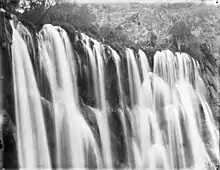 Due to the effects of flash floods, the appearance of Havasu Falls and its plunge pools has changed many times.[3] Prior to the flood of 1910, water flowed in a near continuous sheet, and was known as Bridal Veil Falls.[4] The notch through which water flows first appeared in 1910, and has changed several times since. Water currently flows as one stream. In the past, there were sometimes multiple streams, or a continuous flow over the edge.[5]