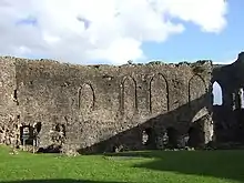 In 1284 King Edward I and Queen Eleanor of Castile visited the castle for the first time during a royal pilgrimage to St Davids. Eleanor was said to be in love with the castle. Four years later she borrowed a huge amount of money in those times to purchase the castle from the de Bohun family and loaned £407 (an extreme amount in those days) to fully rebuild the castle and complete its transition fully into stone.[1] A massive scale reconstruction took place, and it was completed a year later in 1290, shortly before she died, although it long became known as the "Queen's Castle at Haverford".[5] Today much of what remains is dated to Queen Eleanor's 1290 version, including the extensive curtain wall.[5] The castle remained in Royal possession after Eleanor's death and it was granted out to various wealthy tenants.[1] In the 14th century, the castle was occupied by many owners, amongst them was Edward, the Black Prince, from 1359 to 1367. The castle was owned by the crown from 1381 to 1385, who paid for restoration works of the castle. These works proved important later, as in 1405 the castle was strong enough to fend off an attack during Owain Glyndŵr's War of Welsh independence.[5] The town walls around the high ground near the castle also did much to protect the castle from invaders, although nothing remains of these town walls today. Over the centuries the castle was visited by numerous nobles and monarchs such as King Richard II and Oliver Cromwell.[6]