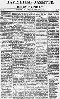 Nathan Burrill and Caleb Hersey established the paper in 1821 in Haverhill; politically it supported the Federalists. In 1823 the paper absorbed the Essex Patriot. Among the Gazette's editors: Edward G. Frothingham, John H. Harris, Arthur Asa Hill, Isaac R. Howe, E.P. Rodgers, William Ellsworth Smythe, Jeremiah Spofford, Abijah W. Thayer, John Greenleaf Whittier.[6][7] Publishers have included Howard & Hill.[8] By 1904 it had a circulation of about 8,000 subscribers.[9]
