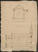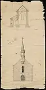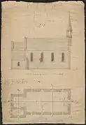 Havstein cemetery was consecrated on 14 August 1854 to serve the western part of the city. Soon after, a church was built beside the cemetery. The church was consecrated on 30 November 1857. The church was originally built as an annex for Strinda Church, the main church for the parish. The neo-Gothic, stone church was built in a long church style and designed by the architects Heinrich Ernst Schirmer and Wilhelm von Hanno. The altarpiece was designed in 1863 by sculptor Ole Laulo (1825-1901).[4] In 1900, the original tower on the roof of the nave was removed and a new wooden tower was built on the west side of the building. The tower was designed by architect Erik Selnes. In 1926, a baptismal sacristy was built on the south side and the whole church got a new roof. The stained glass in the church is from 1968 and was made by artist Carsten Lien (1894-1970)[5].[6]