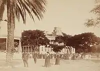 ʻIolani Palace, 1882 (foreground left to right) Kalakaua, Charles Hastings Judd, Kapiolani, and Antoinette Manini Swan.