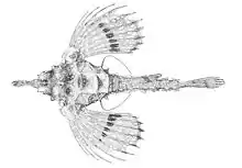 Eurypegasus papilio generally have 8 tail rings and reaches 7.6 cm.[4][5] Their bodies are flat and encased in bone plates, believed to be for protection against predators. They shed their armor to get rid of parasites up to once every 5 days.[2] They have an interesting feeding mechanism that involves their jaws. Their jaws cannot be seen when their mouths are closed due to being covered by the lachrymal and being tucked in a cavity made by the nasal rostrum. The upper jaw unfolds when the lower jaw sinks, which makes the oral cavity expand and form a tube.[6] This tube mouth is then used by the Eurypegasus papilio to suck up their prey, which happens to be tiny invertebrates living in their demersal habitat.[2]