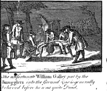 In 1740, riding officer Thomas Carswell and a party of dragoons found about 15 cwt (750 kg) of smuggled tea in a barn at Etchingham and were taking it to Hastings in a cart. James Stanford of the Hawkhurst Gang rode round the area and collected about thirty men with horses and weapons. After drinking brandy to bolster their courage, they attacked the revenue party at Silver Hill between Hurst Green and Robertsbridge, shooting Carswell dead and capturing the soldiers.[2] One of the smugglers, George Chapman, was later executed and gibbeted in his home village of Hurst Green.[3]